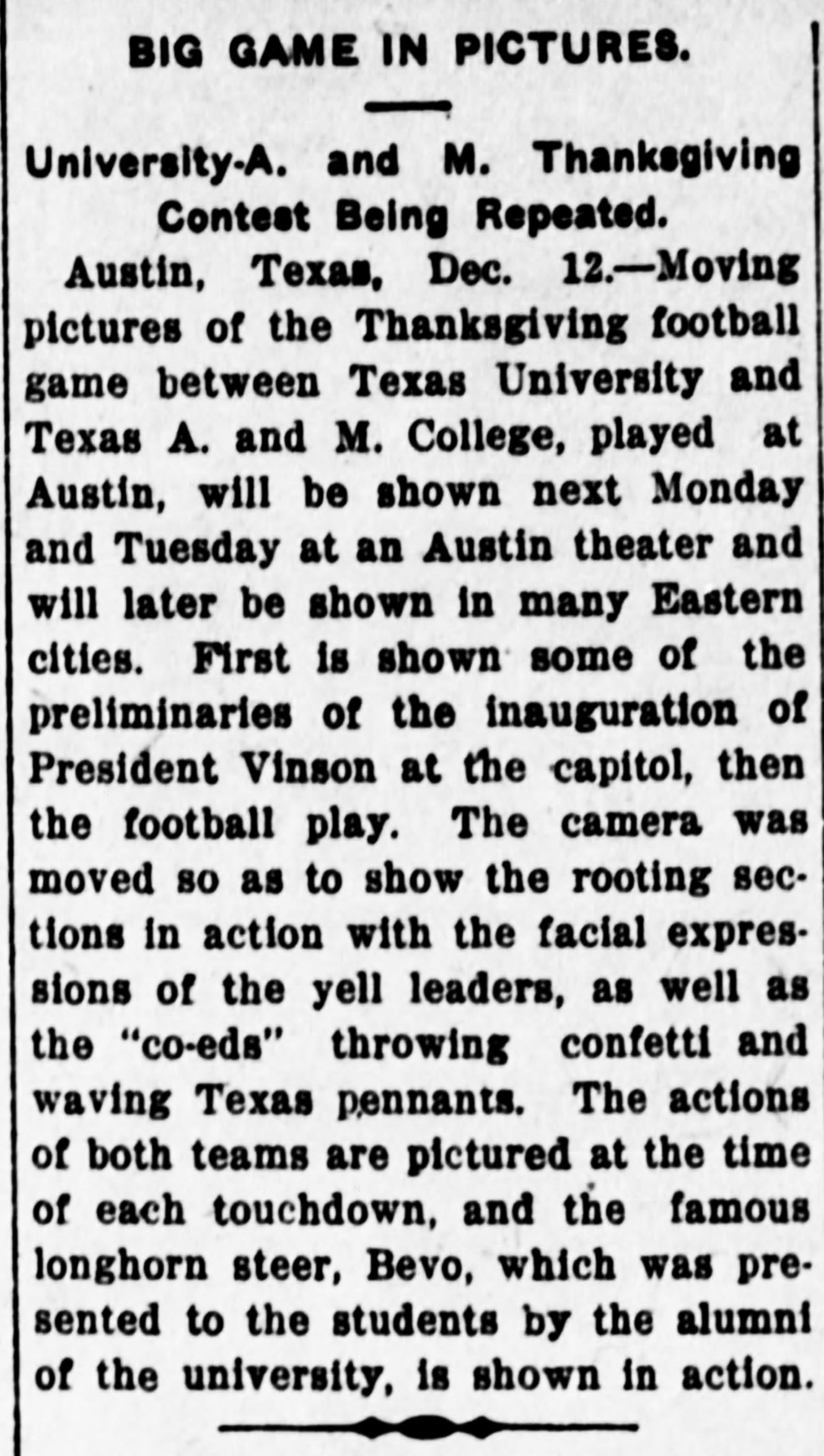 News of the new University president, of the football game, and of the new mascot spread quickly. A silent film was made of the day’s events, including Vinson’s inauguration, the football game, and the presentation of the longhorn steer. Articles about the film appeared statewide on December 12, including in the Austin Statesman and the Bryan-College Station Eagle, which referred to “the famous longhorn steer, Bevo.”