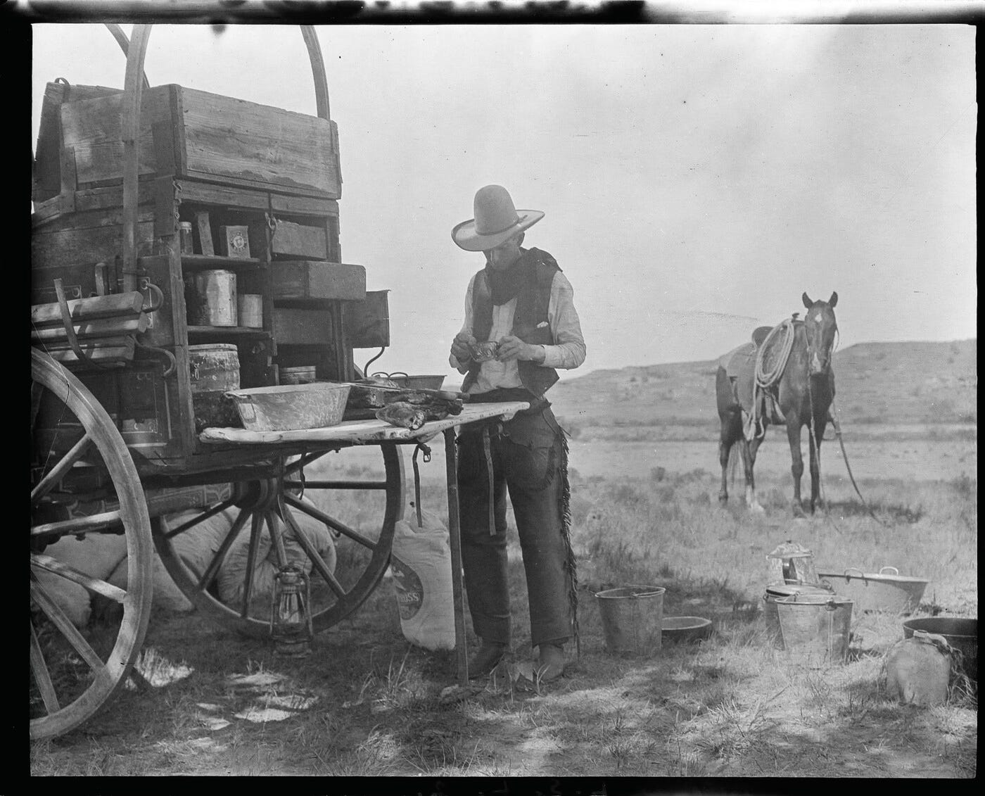 Except for all the horseback riding, cattle punching, roping, and branding, and sleeping in a bedroll on the ground, under the stars, I think Svigel would have felt right at home sitting around a chuckwagon where there were no French presses, filters, percolators, or pumpkin spice lattes, only black, strong, hot coffee—and plenty of it. For the average cowpuncher there was nothing better than a steaming cup of coffee—with meals, between meals, first thing upon waking, and last thing before sleeping. If a cook wanted to keep a mutiny from forming, he made sure he had a large pot of coffee on to boil at all times because cowboys drank it by the gallon. On one ranch, from August 1882 to August 1883, Oliver Nelson, an old cook, boiled up thirteen 160-pound sacks of coffee to keep his ranch hands satisfied.