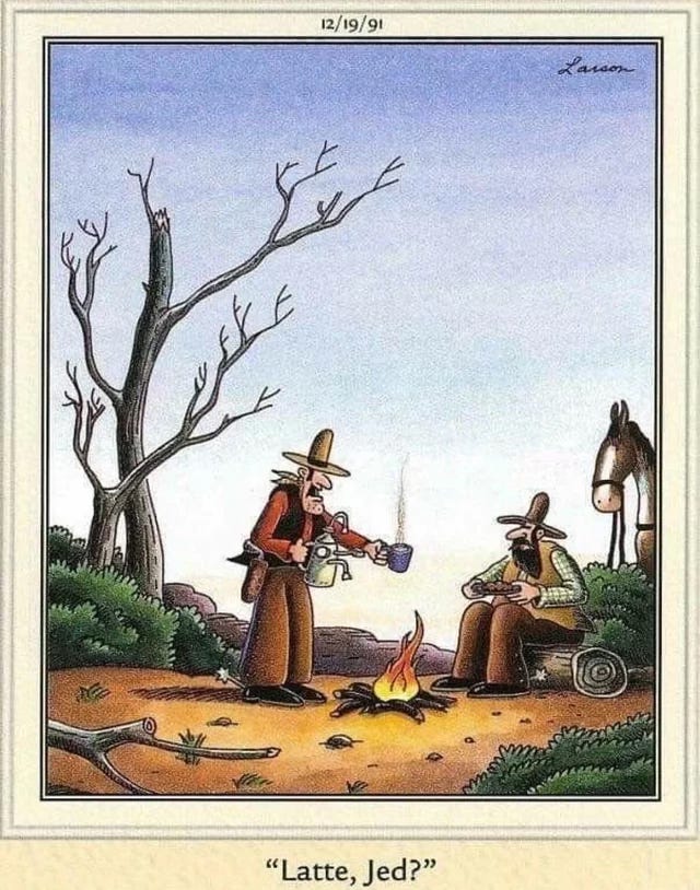Fantastic piece on the history of trail coffee. The bit about boiling it for 30 minutes and testing with a horseshoe is genius, basically reducing the water content till the coffe's concentrated enough to stand on its own. I've tried campfire coffee a few times and that cold water splash at the end really does work for settling the grounds. Never thought about why until reading this, but it cools the surface layer fast enogh that the grounds sink instead of floating.