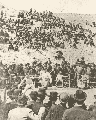 The men stepped into the square, took off their overcoats, caps, and trousers, and shook hands in the center of the ring. Fitzsimmons and Maher donned their five-ounce gloves as referee George Siler gave instructions and warnings. Returning to their corners, timekeeper Lou Houseman banged a gong and the fight was on.