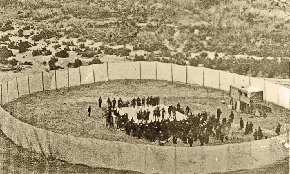 On the day of the fight, February 21, 1896, it had rained off and on over the arid Trans-Pecos where Langtry was situated. The 182 or so spectators and the two combatants had come by train from El Paso. To reach the battle site, according to The New York Times, they had to navigate a “precipitous descent of a seldom-used wagon road . . . over rocks and boulders” and across “500 yards of sand and mud” to reach the makeshift bridge over the Rio Grande. There, at the mouth of Eagle Nest Canyon, in the middle of the river, on the Mexican side, stood a boxing ring, encircled with a sixteen foot high canvas wall.