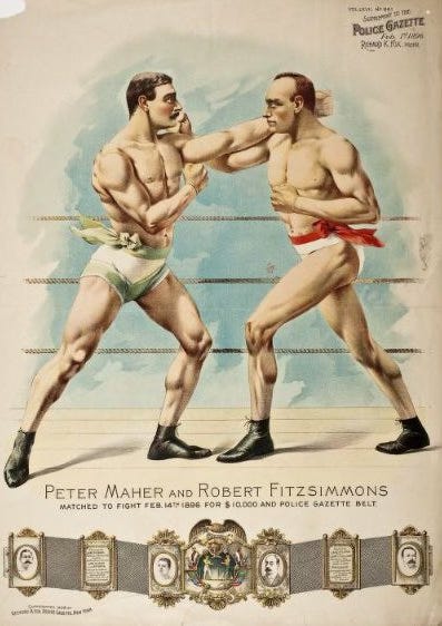 When Fitzsimmons heard that Corbett had bestowed his title on Maher, he cried foul. Since he had defeated Maher three years earlier, Fitzsimmons claimed the title for himself—and had the backing of many in the fighting community, which said that Maher’s title was merely “a gift championship.” The National Police Gazette, the leading boxing rag at the time, argued that Maher had to beat Fitzsimmons in the ring to authenticate his claim to the title, writing, “He has been hailed as the champion but conservative, reasonable, thinking people, appreciate the fact that the simple act of handing a title to a man on a gold plate is not the only thing that is required to make him a champion.”