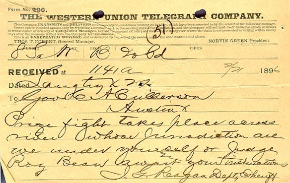 When Mabry learned about the change of venue, he telegraphed the Vale Verde County sheriff’s office. Deputy Sheriff J. G. Reagan went to Langtry to question Bean, who assured the lawman that no laws would be broken in his jurisdiction, and that as far as he knew the boxing match was to take place across the river. Reagan then dispatched a telegram to Governor Culberson: “Prize fight takes place across river whose jurisdiction are we under yourself or judge Roy Bean await your instructions.”