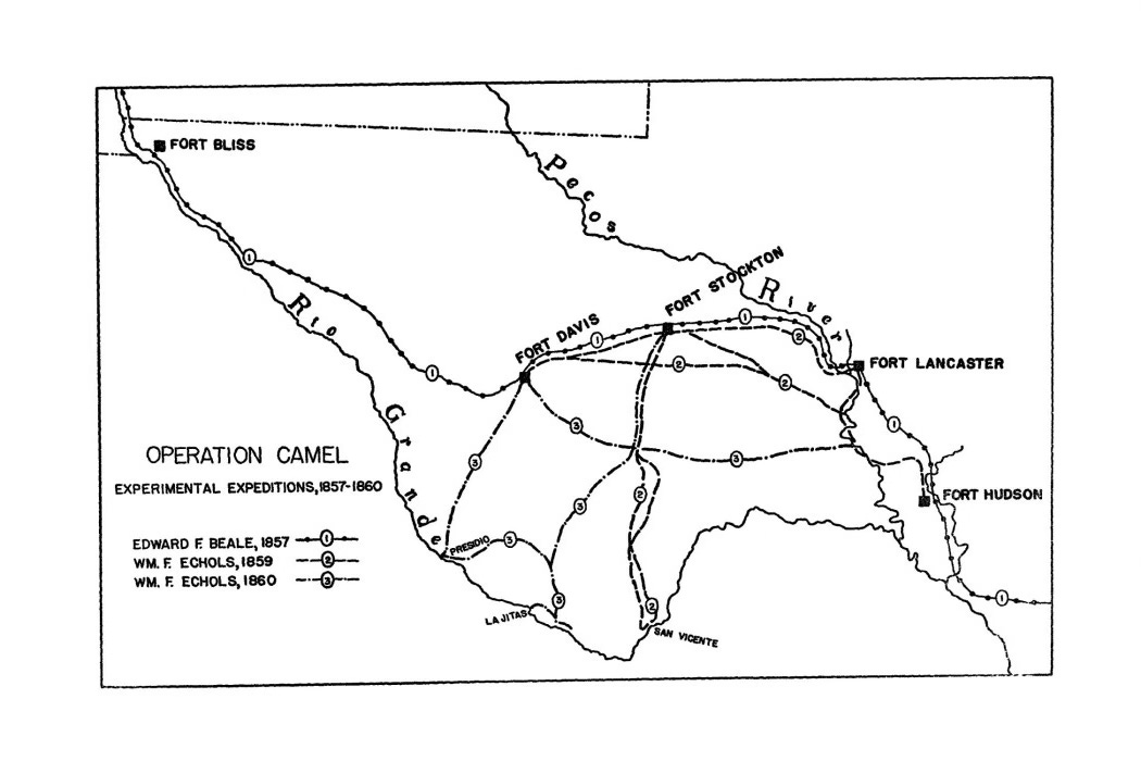 Frank Bishop Lammons, “Operation Camel: An Experiment in Animal Transportation in Texas, 1857–1860,” The Southwestern Historical Quarterly, vol. 61, no. 1 (July 1957), 20–50.