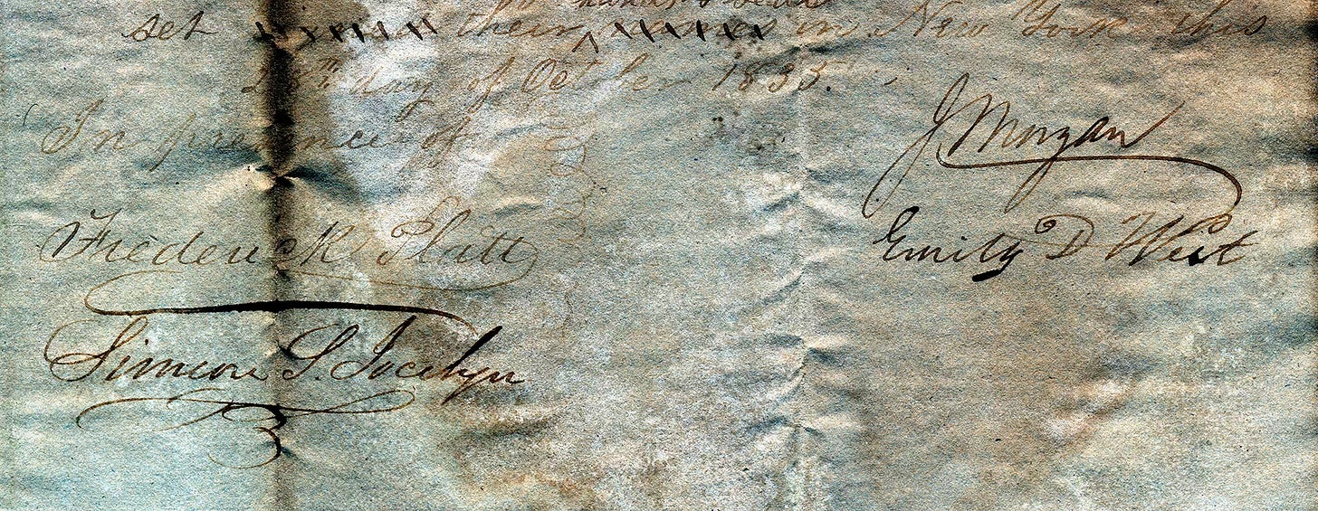 The contract was witnessed by Simon S. Jocelyn, a prominent New Haven antislavery philanthropist, who sponsored a number of free Black organizations and institutions. The 1830 census recorded several persons living in his household: six Whites and one “free colored female” between the ages of ten and twenty-four—likely Emily West.